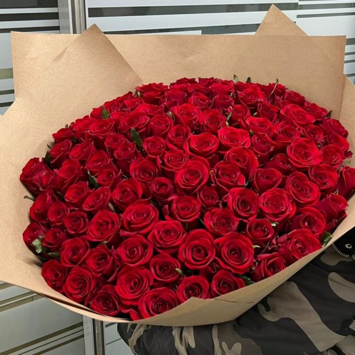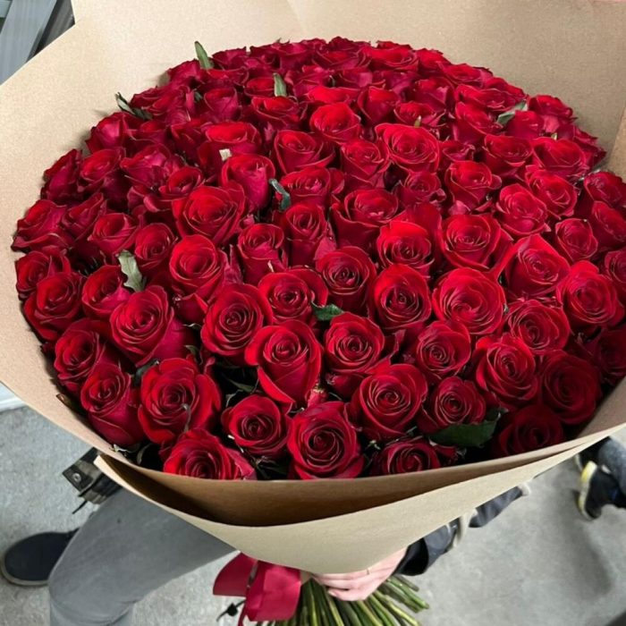 Лента атласная – 2 шт.Крафт – 5 шт.роза премиум красная 70 см – 101 шт.